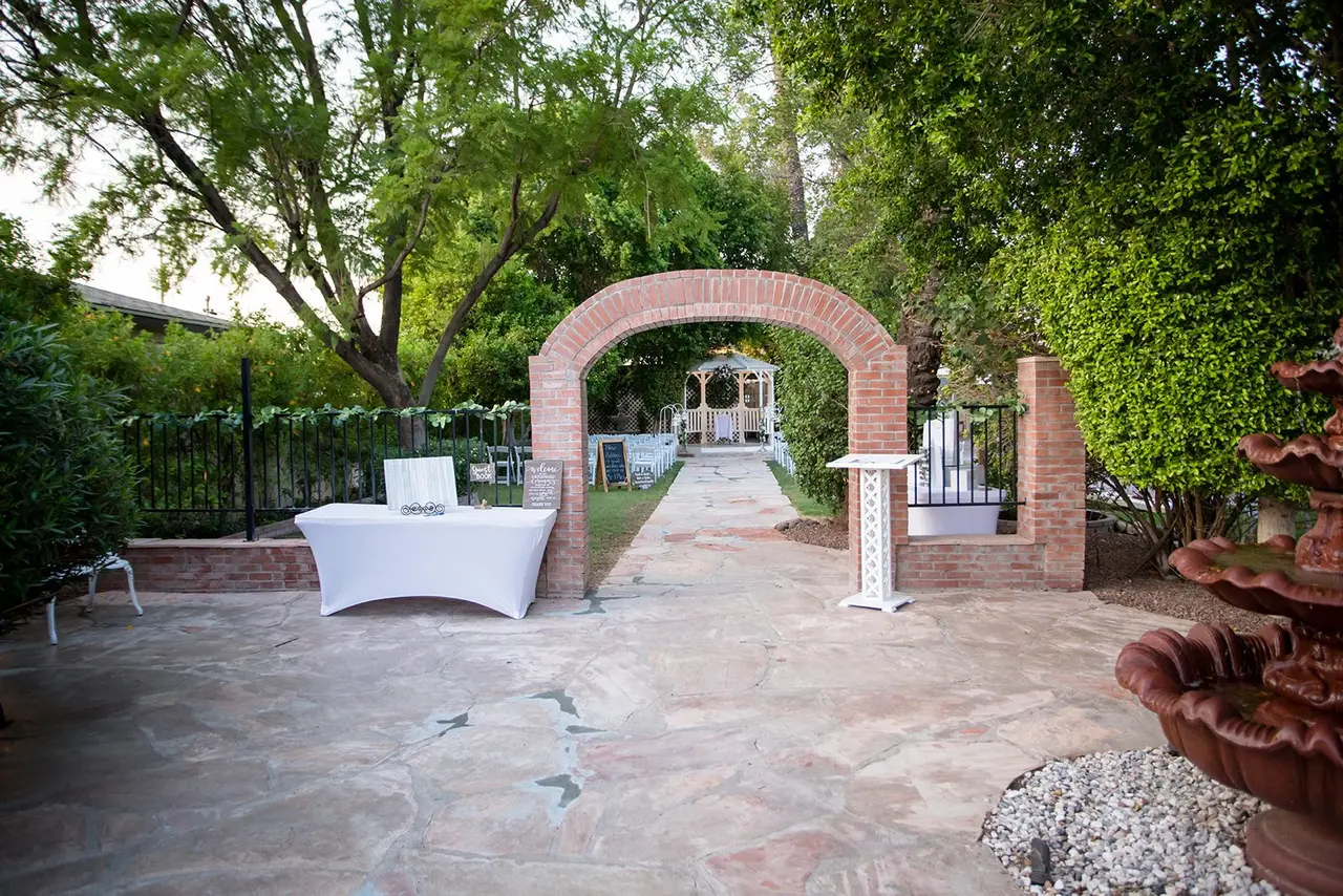 In the heart of historic Peoria, An Old Town Wedding and Event Center is a lush garden oasis where vows are exchanged under a white gazebo surrounded by fountains, flower beds, and towering trees. Birds sing as couples celebrate, and flexible policies—like outside catering and BYO alcohol—keep the day personal. With a newly renovated venue, on-site staff, and space for 275 guests, this enchanting space blends timeless romance with practical convenience.