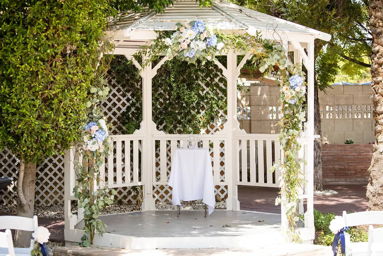- Romantic gazebo ceremony with fountains and natural beauty
