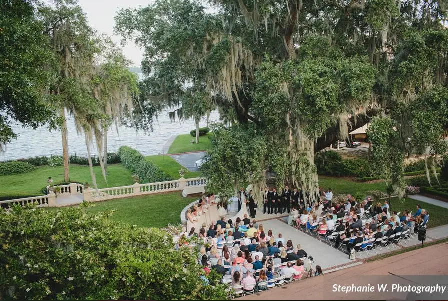 A vintage riverfront retreat, The Club Continental in Orange Park sets romance beneath 300-year-old oaks draped in Spanish moss. Ceremonies overlook the St. Johns River; cocktails unfold on garden patios beside the pool and cabana; then dining and dancing shimmer beneath wrought iron, marble floors, and French doors. With overnight accommodations and private-club ambiance, it’s a timeless setting for destination-style weekends close to home.