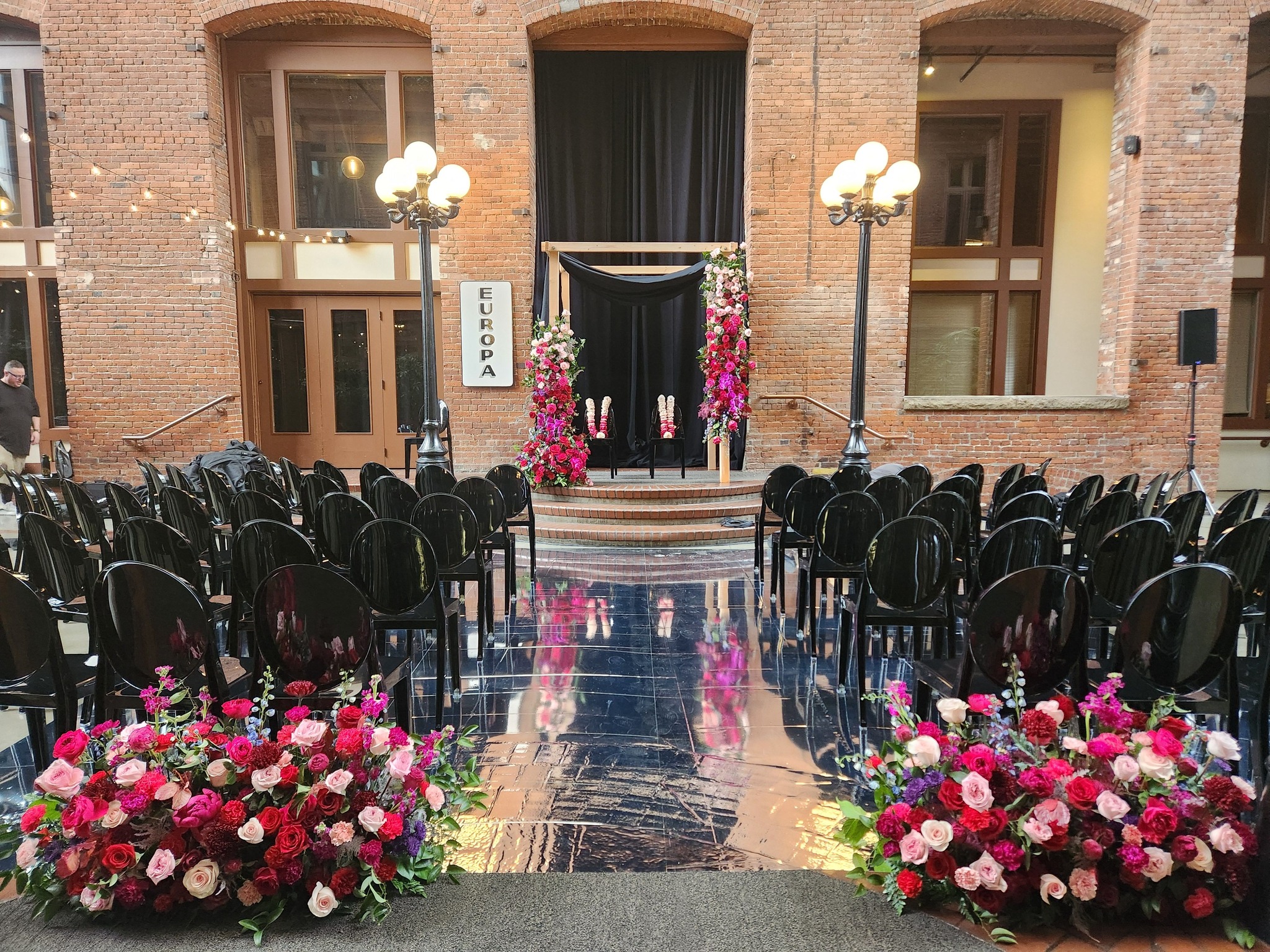 Europa at Court in the Square blends Seattle history with breathtaking architectural design, offering couples a truly cinematic place to say “I do.” The venue centers around a six-story glass atrium connecting two historic brick buildings, creating a naturally lit, greenery-framed backdrop perfect for ceremonies year-round. A retractable roof brings fresh air and open-sky vibes in summer, while getting-ready rooms and convenient accommodations support a smooth wedding flow. With included tables, chairs, setup, and teardown, Europa at Court in the Square ensures a seamless, visually stunning experience from vows to last dance.